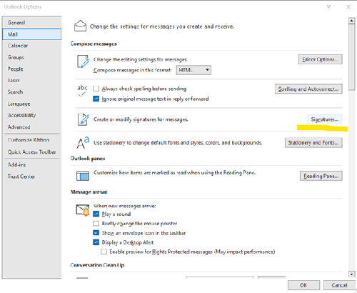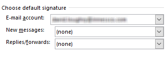 Click on “Signatures …” to configure your default Signatures. If you signature has been migrated from your old system, you will be able to select it in the New messages and Replies/forwards dropdowns shown below.