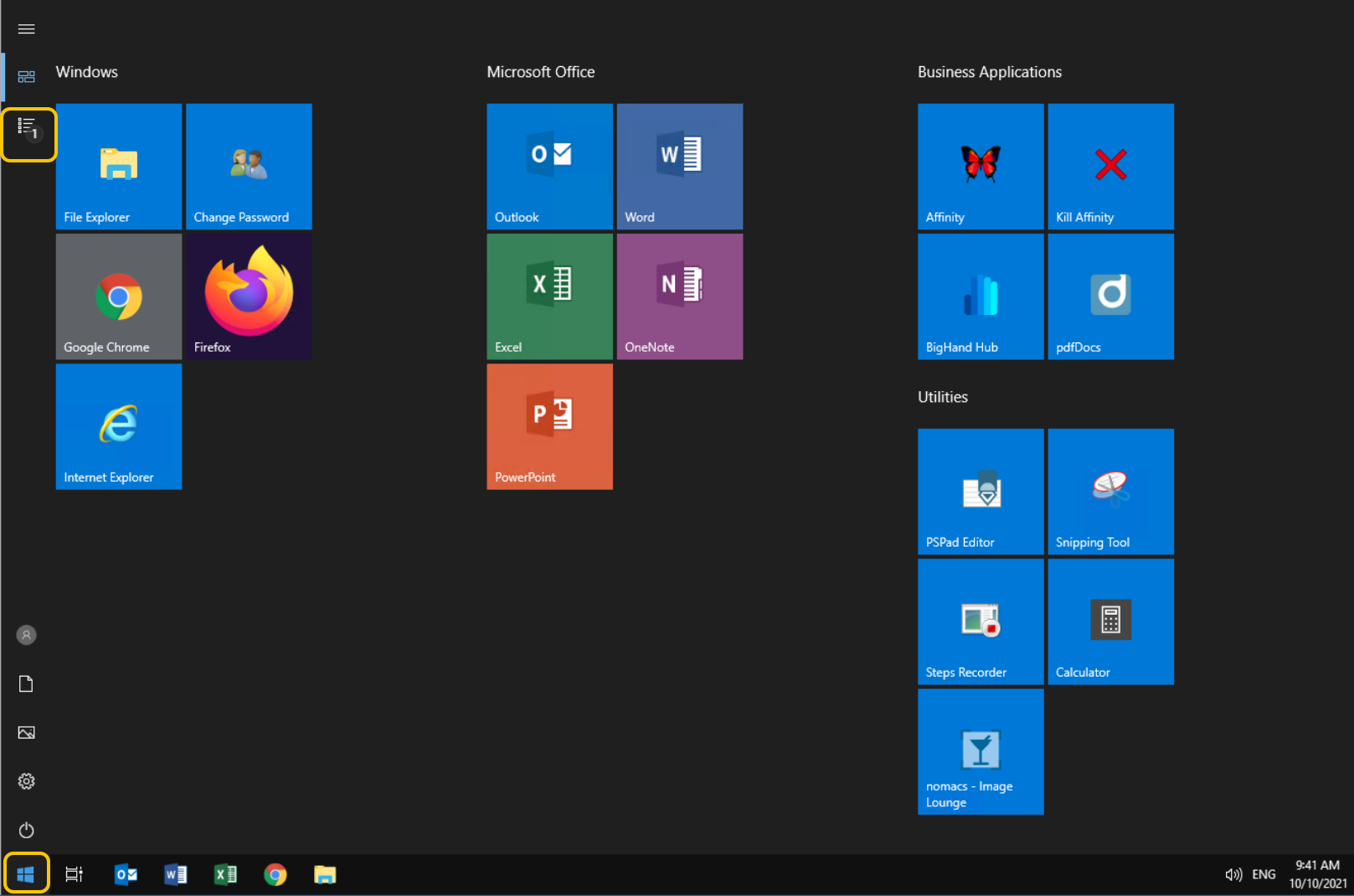 If the application that you are looking for is not on the Start Page, click the highlighted button at the bottom left hand corner of the screen.