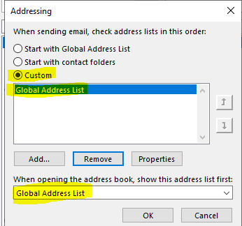4. Change the order to Custom, delete the entry named “Contacts” and change the last option to “Global Address List”.