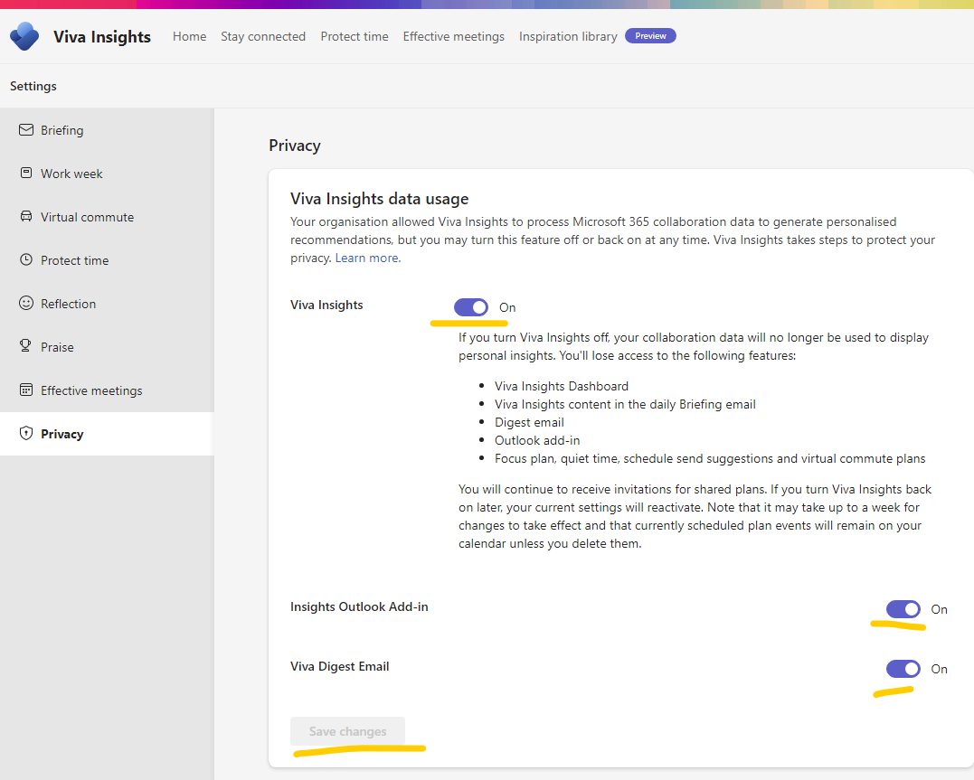 Here you can turn off Viva Insight altogether or just turn off the Outlook Add-in and Viva Digest Email.
