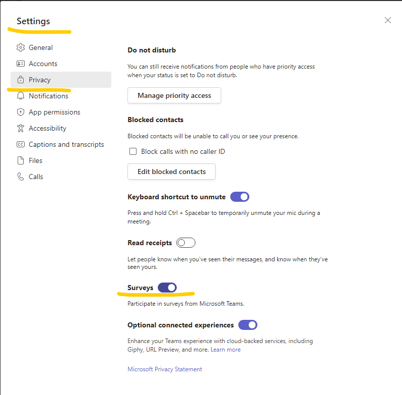 In "Settings" choose "Privacy", then turn off the "Surveys" toggle.