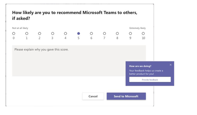 This pop-up survey is displayed to users from time-to-time in Teams. When a user selects "Provide Feedback" in the notification, the survey is displayed for them to complete.