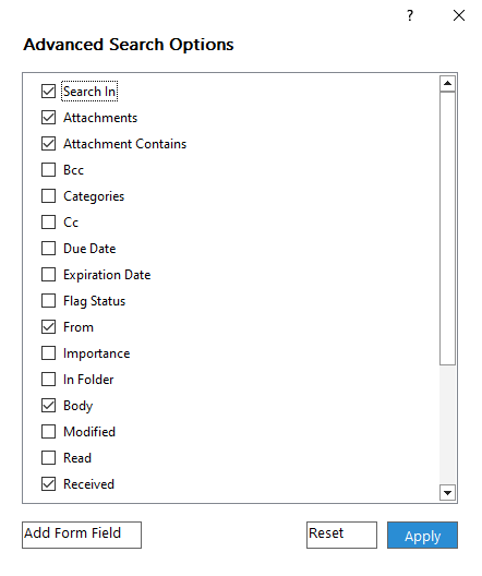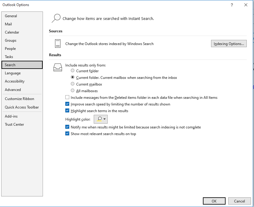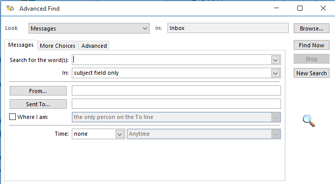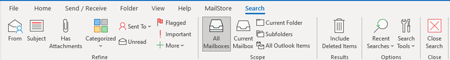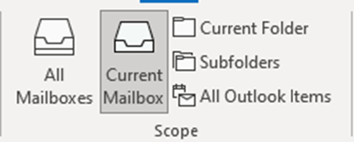 "Scope" lets you specify where to search—Current Folder (a narrow scope), Current Mailbox, or All Outlook Items (the broadest scope).