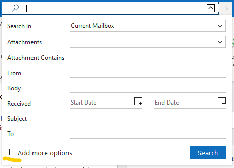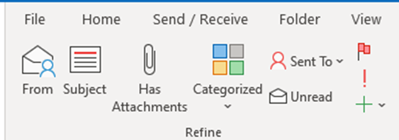 "Refine" lets you filter to a certain sender or messages that have attachments or are categorized.