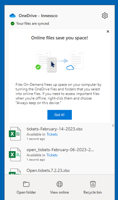 Once the sync is complete, you will see this message. It is showing you that your files have been moved online and that you can still choose to have certain files remain on your PC by right-clicking the item and choosing "Always keep on this device".