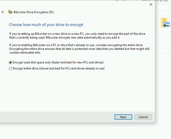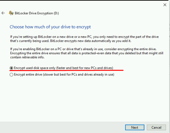 3. Select 'Encrypt used disk space only (faster and best for new PCS and drives)'.