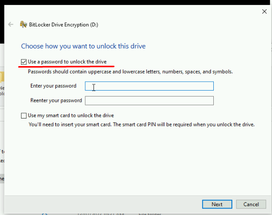 4. Tick the 'Use a password to unlock the drive' box and enter your password.