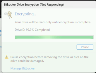 -If the BitLocker Drive Encryption window is not responding, please click 'Wait for the program to respond'. After a couple of minutes, the program will close down, and you should be able to move documents.