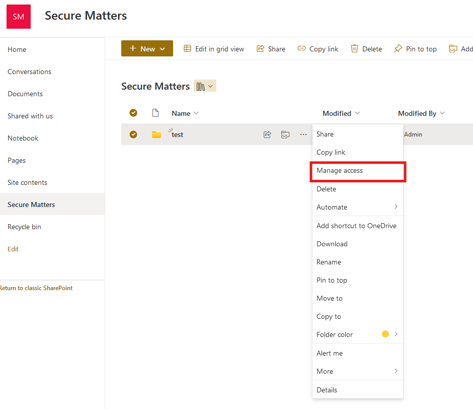 - This will create a dedicated SharePoint site where you can set up folder-specific permissions.