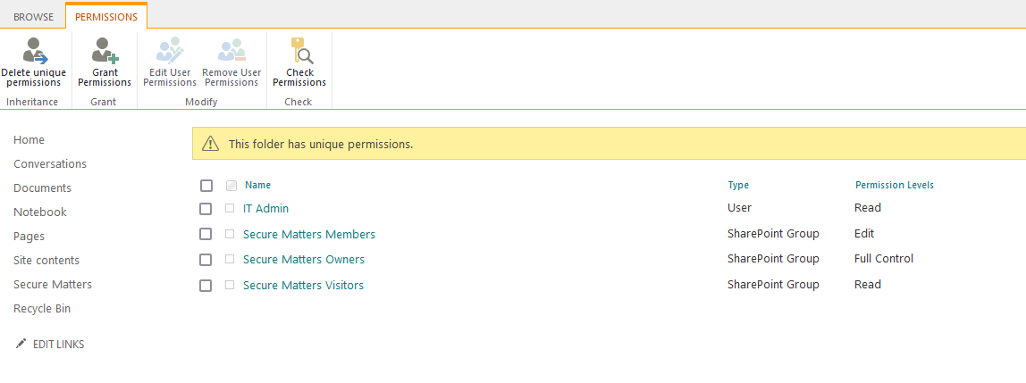 - Use the Check Permissions feature to verify that users or groups have the intended access level.