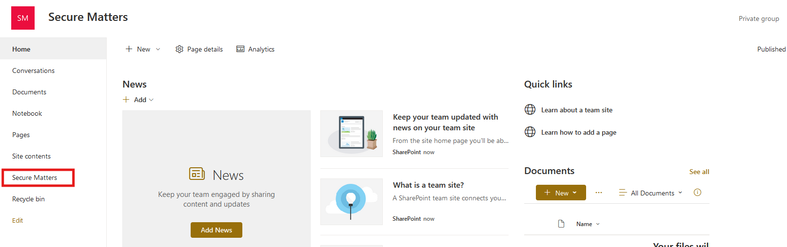 E.g. (https://<company>.sharepoint.com/sites/securematters/SitePages/CollabHome.aspx) - Once on the site, you’ll see options to navigate through different sections, including Document Libraries.