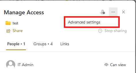 - In the Manage Access pane, select Advanced settings to view detailed permissions settings.