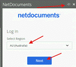 - Once the NetDocs pane is open, click the Pin button to keep it there, then set the region to AU and click Next