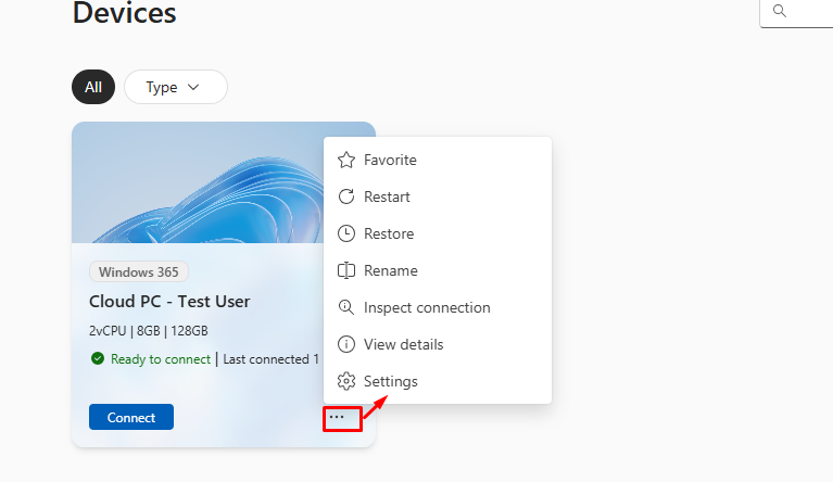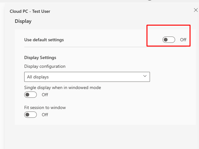 - If you'd like your the Cloud PC to display across multiple screens → click the 3 dots → Settings → Turn off "Use default settings".