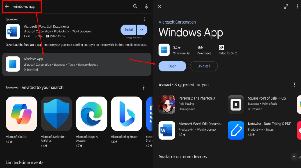 Open Play Store → Search for WIndows App → Click on Install/OPen