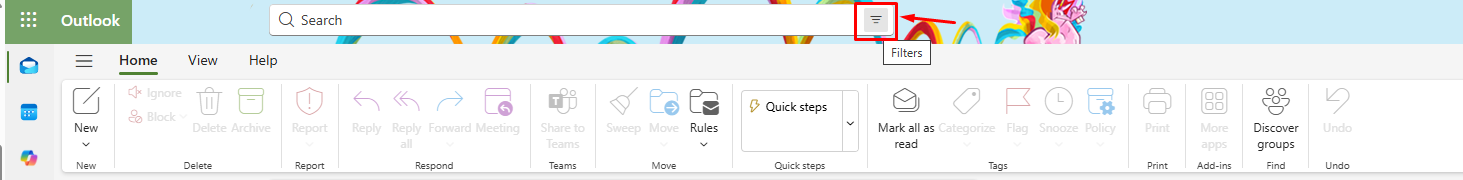 Hover over the search bar at the top and click the three horizontal lines (filter icon) to bring up the Outlook search filters.