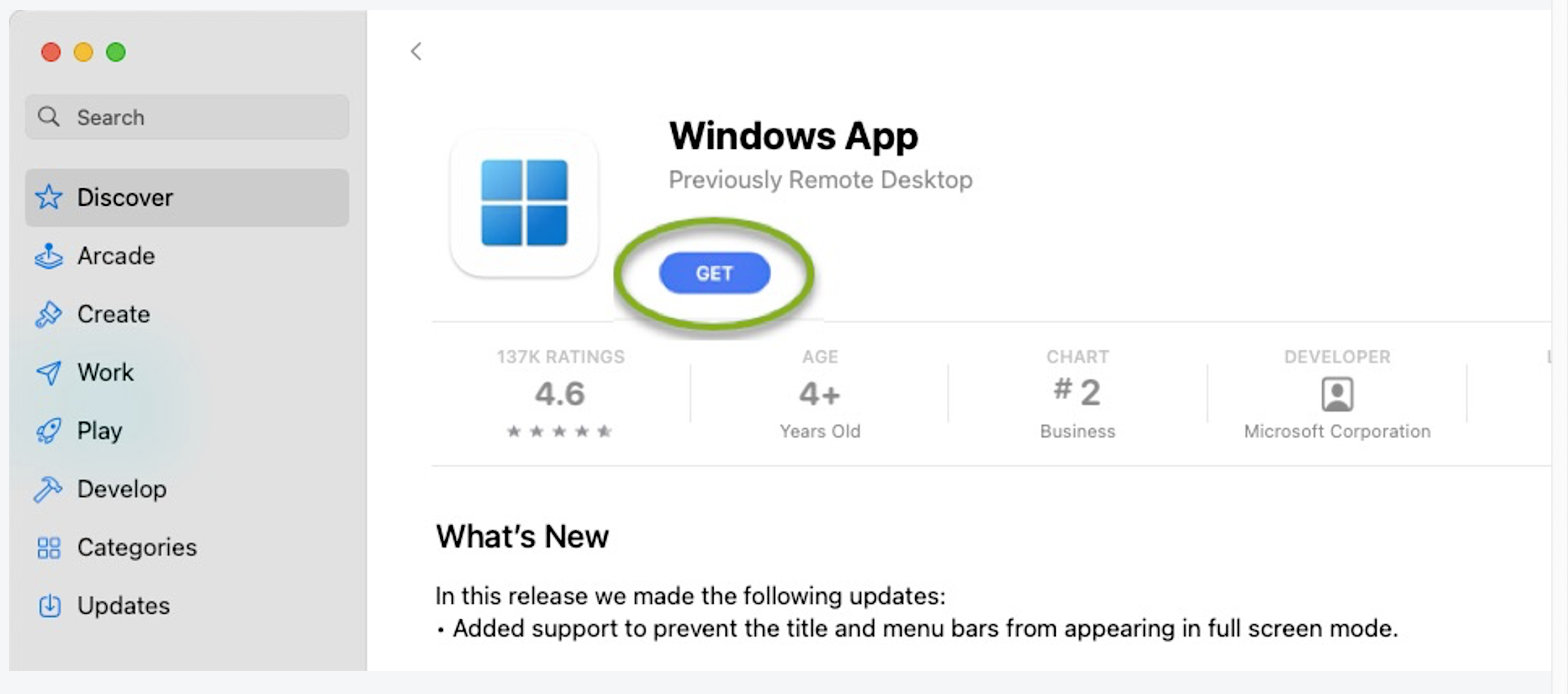 macOS version 10.14 or later is requiredStep 1: Open the App Store and search for Windows App. Click Get to download and install it.